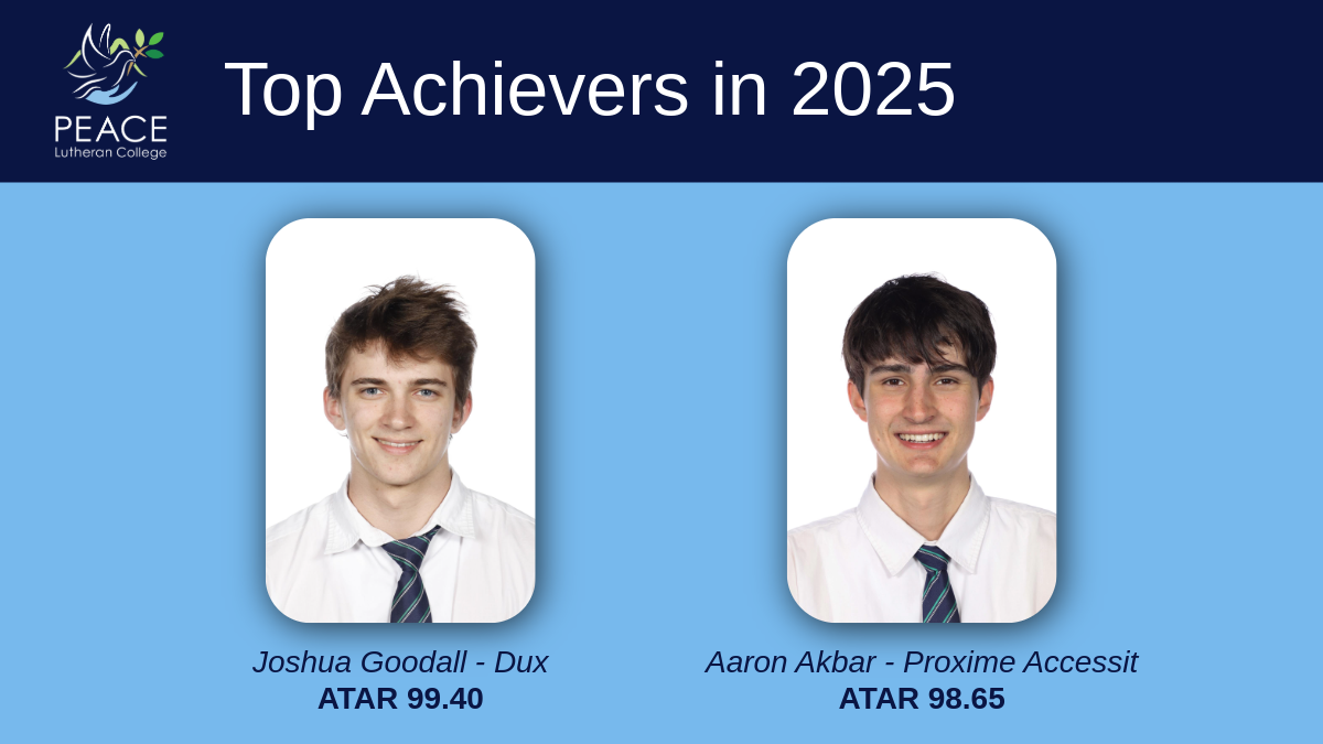 Peace Lutheran College proudly congratulates our Year 12 cohort on their outstanding achievements. Each student has shown remarkable dedication, resilience, and growth β spiritually, academically, and personally β which has been truly inspiring. While these results are commendable, they represent only a small part of the significant personal development each student has experienced.